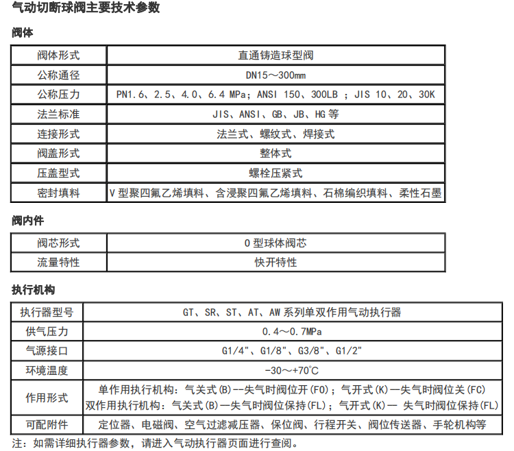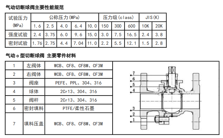 本公司生产的气动O型切断球阀是由双(单)作用气动活塞式执行器和浮动球阀组成。附件配行程限位开关、电磁阀、空气过滤减压阀。现场只需0.4-0.7MPa气源可实现开关操作,并送出二对无源触点信号指示阀门的开关位置。