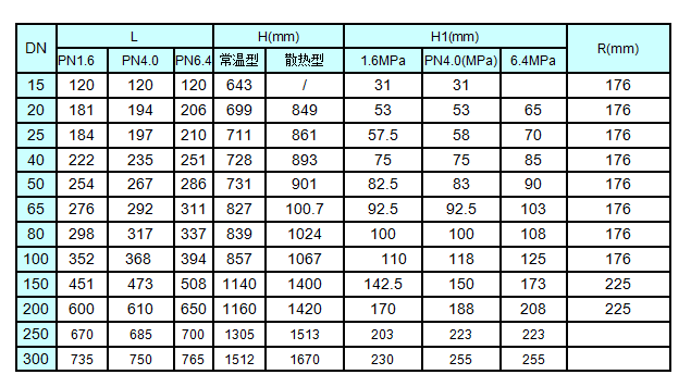 公称通经DN 20 25 32 40 50 65 80 100 125 150 200 250 300 阀座直径mm 10 12 15 20 25 32 40 50 65 80 100 125 150 200 250 300 额定流量系数KV 直线 1.8 2.8 4.4 6.9 11 17.6 27.5 44 69 110 176 275 440 690 940 1200 等百分比 1.6 2.5 4 6.3 10 16 25 40 63 100 160 250 400 630 850 1050 行程mm 10 16 25 40 60 100 允许泄漏量Q 单座式 IV级为KV值的0.01%,按GB4213-92标准 套筒式 III级为KV值的0.01%,按GB4213-92标准 基本误差% ±2.5 回差% 2.0 死区% 1.0 始终点偏差% ±2.5 额定行程偏差% 2.5 可调比 50:1